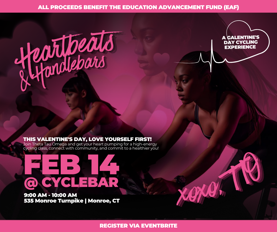 Get ready for an awesome stationary bike workout in celebration of heart health and fun! Join us at Galentine's Day: Heartbeats & Handlebars, where vibes are high and good times roll. Bring your best crew and make memories with Theta Tau Omega—because gal pals, good beats, and a great playlist make the perfect combo. Don’t miss out on this gathering filled with laughs, cheers, and non-stop energy!
